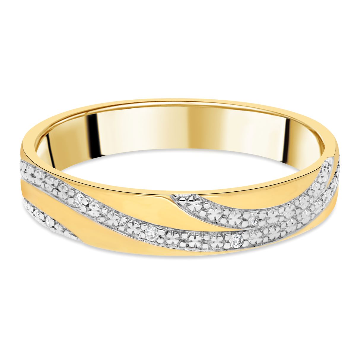 Alliance en or jaune 18 carats sublimée par une vague délicate en or blanc, pavée de petits diamants (poids total 0.015 ct).