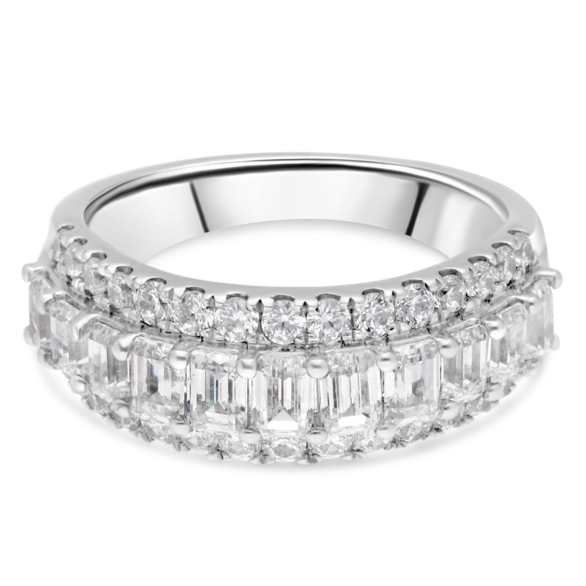 Alliance demi-tour en platine, ornée d'une rangée centrale de diamants émeraudes sublimés par des diamants ronds sur les côtés, se distingue par son éclat raffiné et sa capacité à capturer la lumière sous tous les angles.