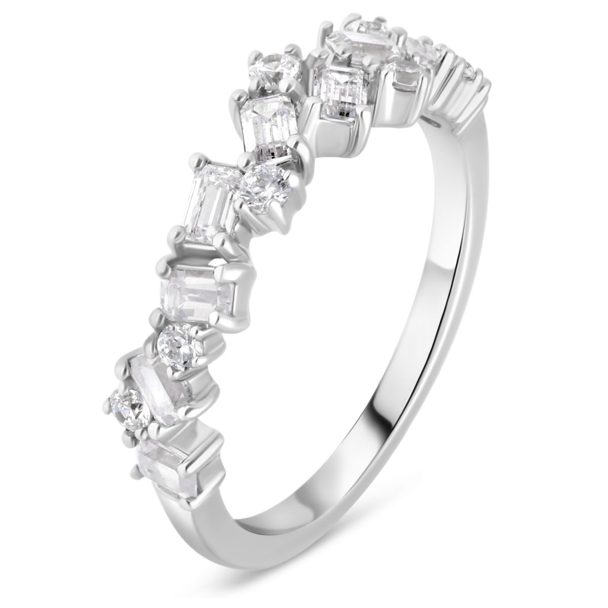 Une alliance demi-tour avec 10 diamants taille émeraude, alternés avec des diamants ronds et sertis de façon déstructurée, est un bijou à la fois audacieux et raffiné. Le design met en avant une disposition asymétrique où les pierres, de formes différentes, sont placées de manière irrégulière, créant un effet visuel captivant.