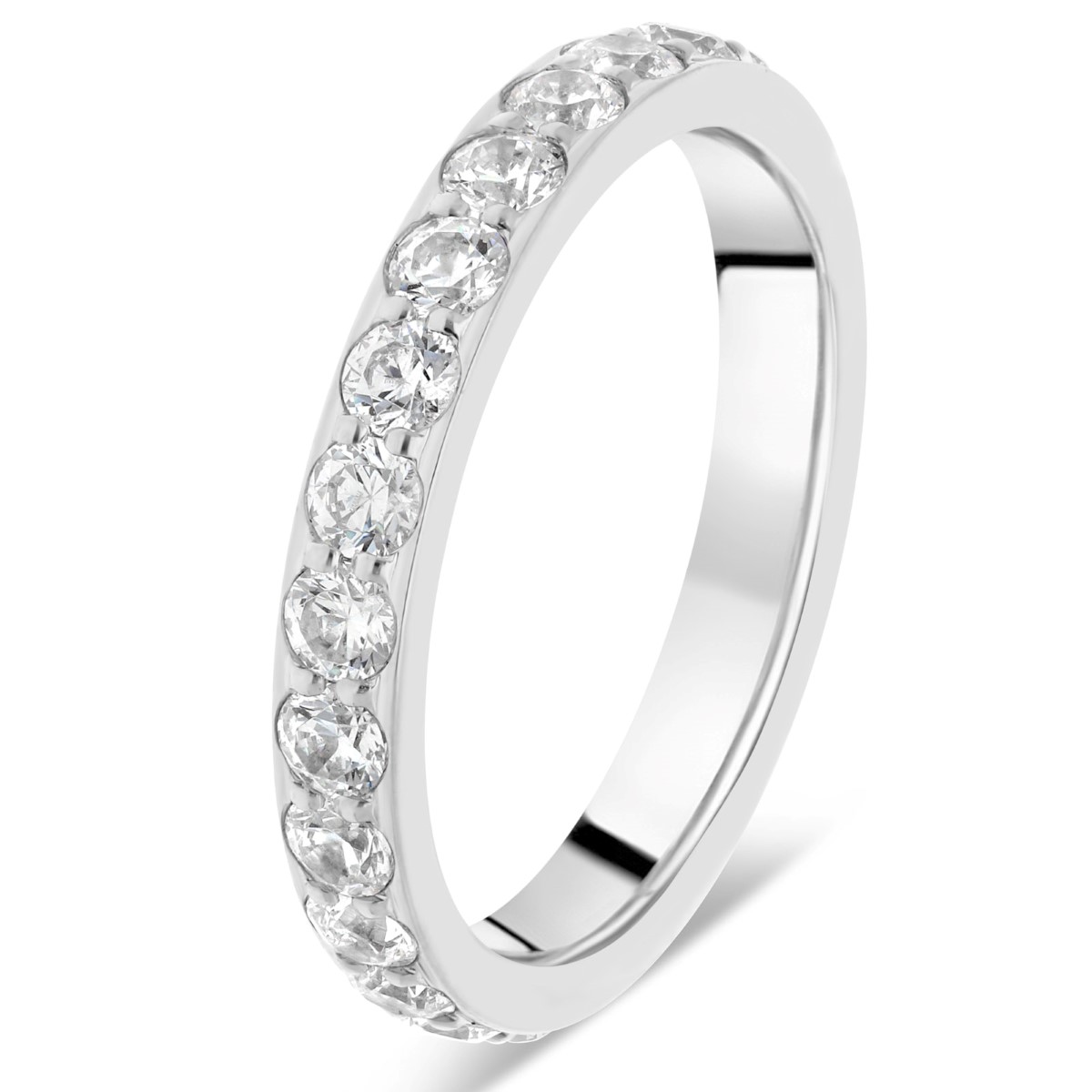 Splendide alliance de mariage pour femme en or blanc, avec diamants taille brillant de qualité HSI ou GVS, tour complet serti 2 mini griffes. Elle existe en plusieurs versions de 0.66 à 1.68 carat. L'intérieur est massif (non-ajouré) pour permettre la gravure et arrondi pour plus de confort.