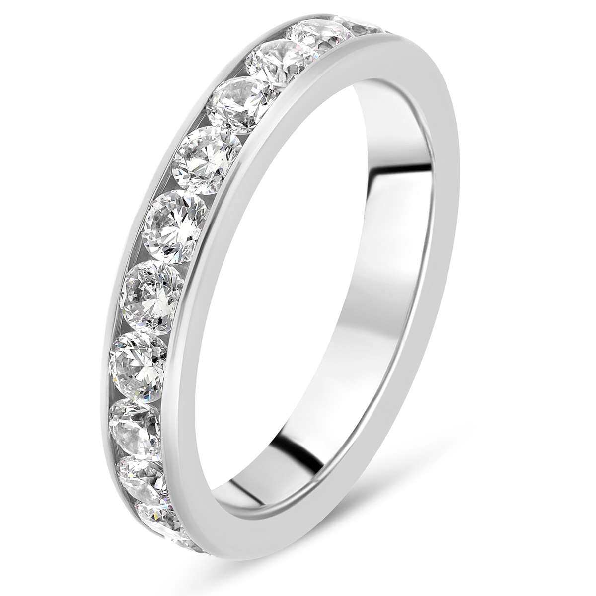 Élégante alliance de mariage pour femme en platine ornée de diamants taille brillant de qualité HSI ou GVS. Les diamants sont sertis en tour complet dans un rail fin. Ce modèle est disponible en plusieurs versions de 0,50 à 2 carats. L'alliance est massive et arrondie à l'intérieur (non-ajourée) pour permettre la gravure et un meilleur confort au porté.