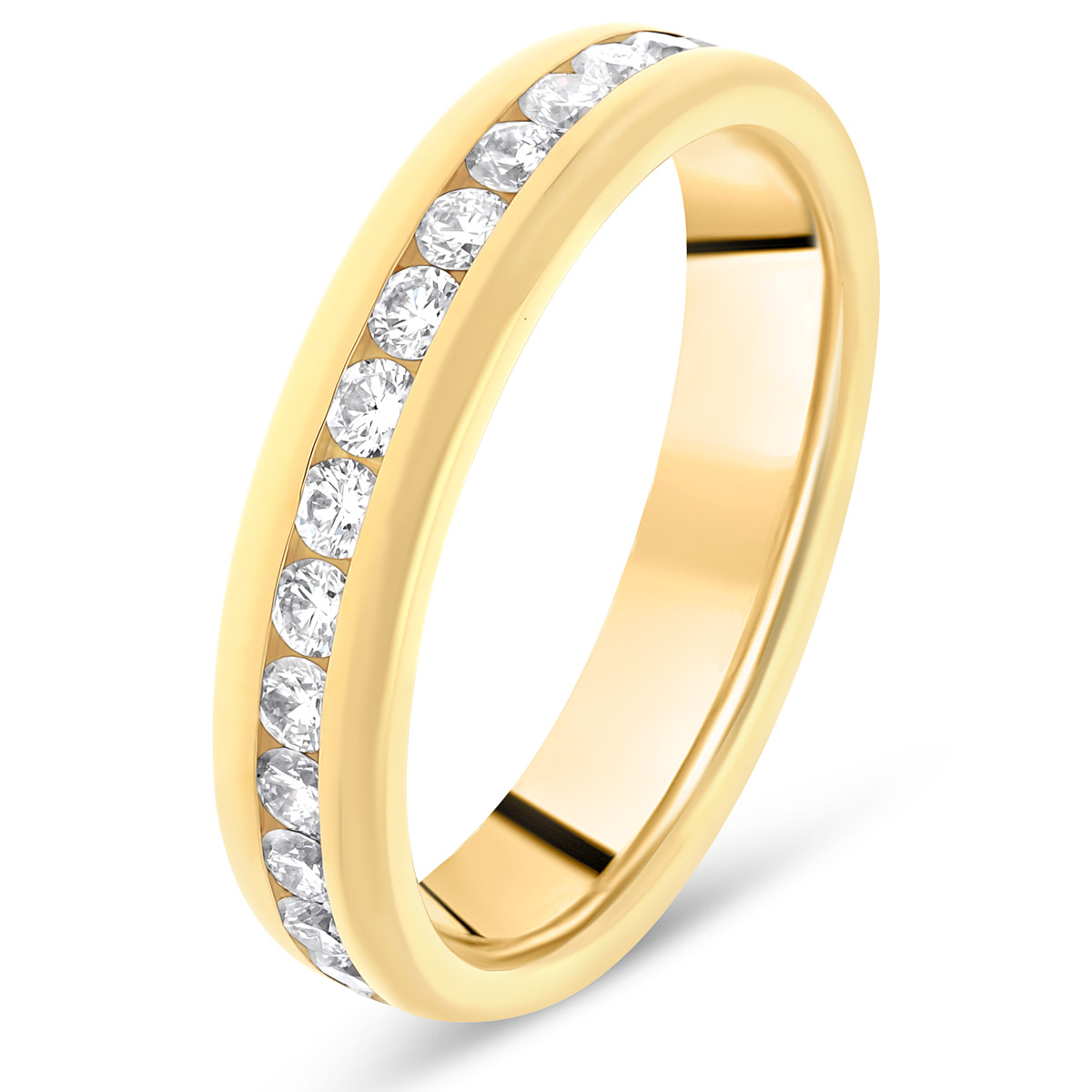 Très importante alliance de mariage pour femme en or jaune, avec diamants taille brillant de qualité HSI, demi tour serti rail large. Existe en plusieurs versions de 0.25 à 1 carats. L'intérieur est massif pour permettre la gravure et arrondi pour plus de confort.