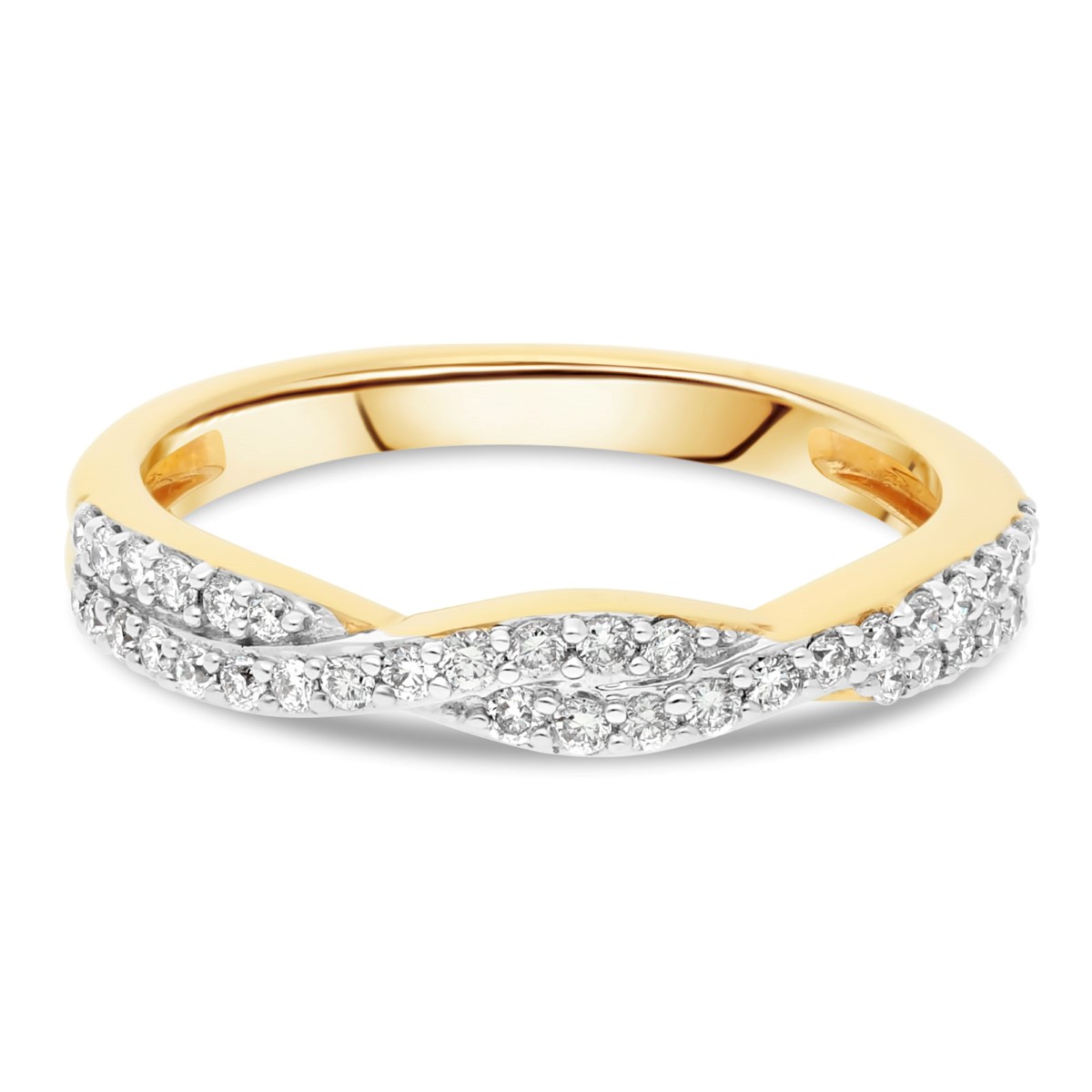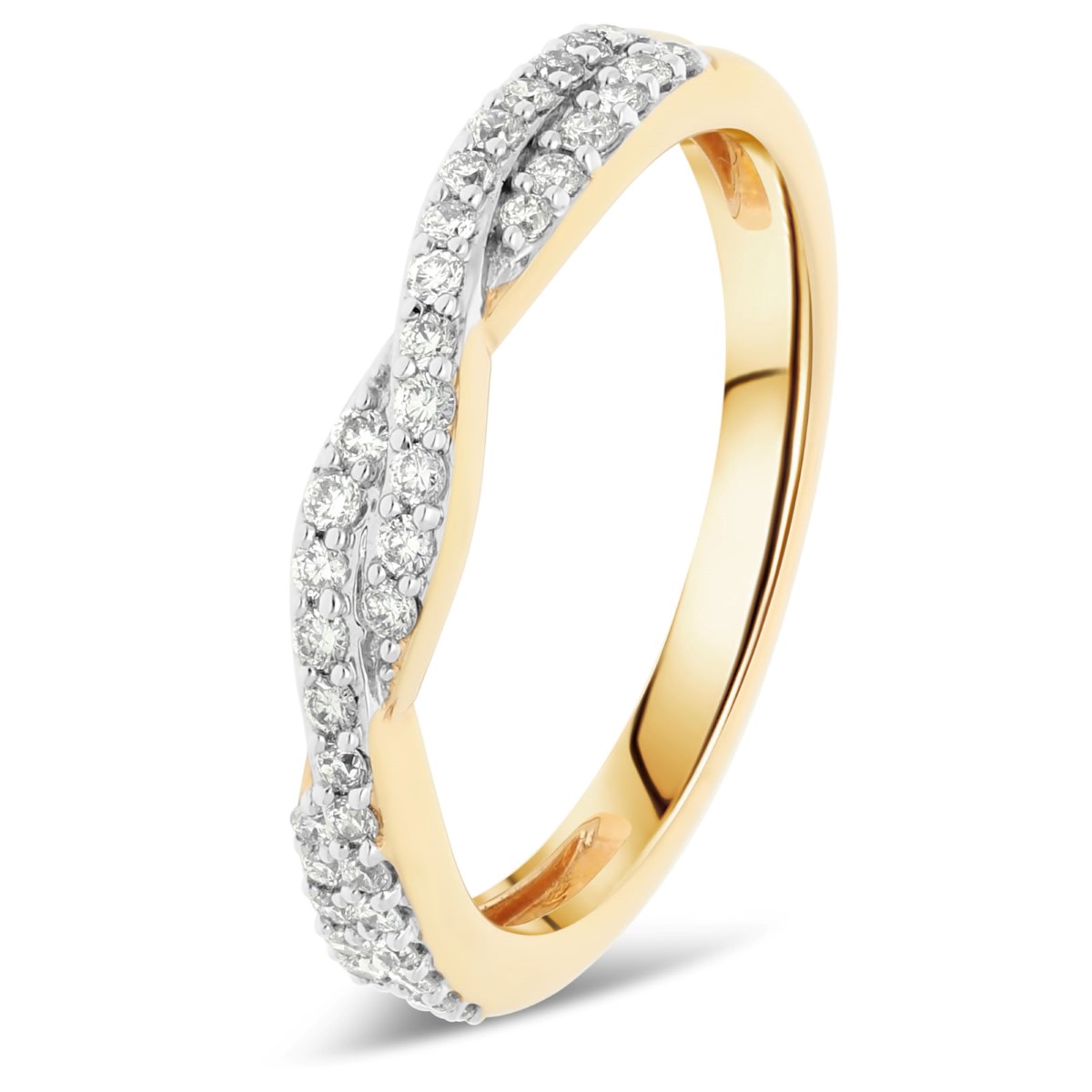 Alliance "Torsadée Diamants" en or jaune 18 carats parée de diamants en pavage de qualité HSI. Ses lignés diamantées en demi tour lui confèrent un aspect original fantaisie.