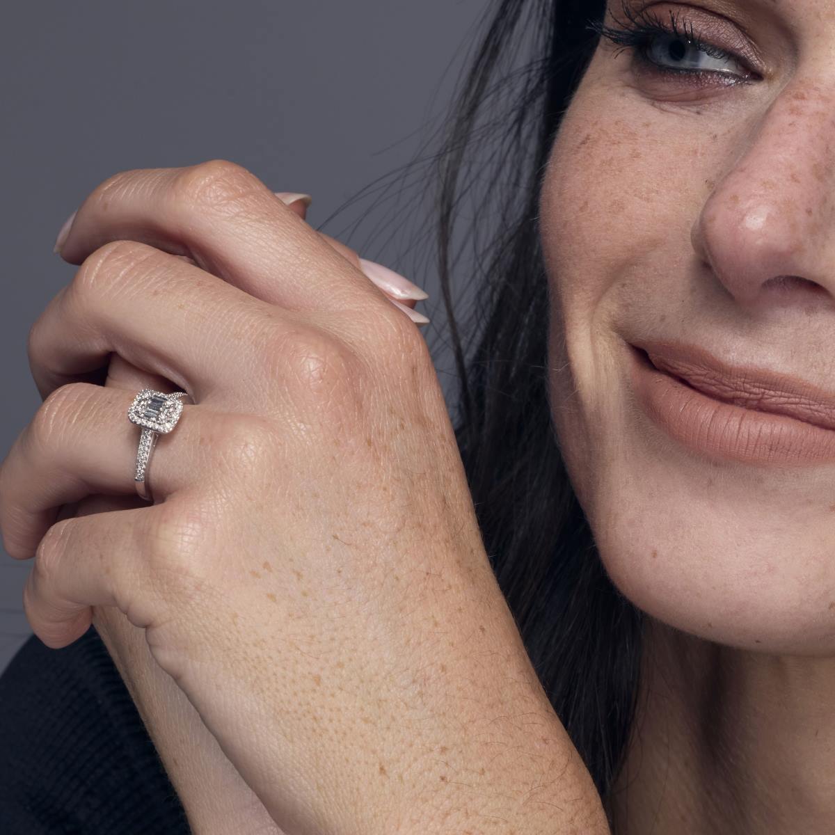 Une bague de fiançailles en diamants naturel HSI et en or 750 millièmes. Son centre de 8,8 mm sur 7,4 mm est composé de diamants taille baguette sertis de manière à créer l' illusion d'une taille émeraude, et entouré de diamants sertis en grains. Le corps de 2,4 mm de largeur est pavé sur sa partie supérieure de diamants sertis en grains.