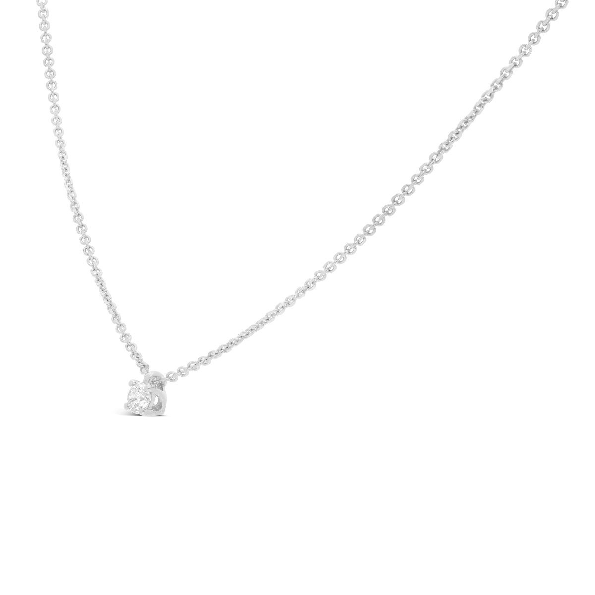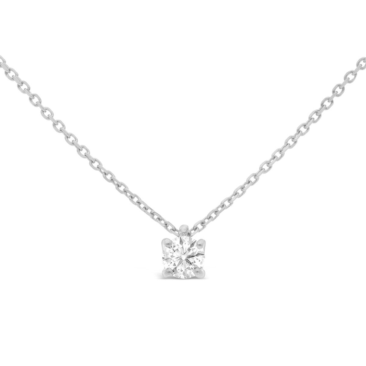 Collier en diamant solitaire 0,15 carat maintenu par 4 griffes. Le pendentif est accompagné de sa chaine maille forçat de 42 cm. Le diamètre du pendentif est de 3,1 mm.