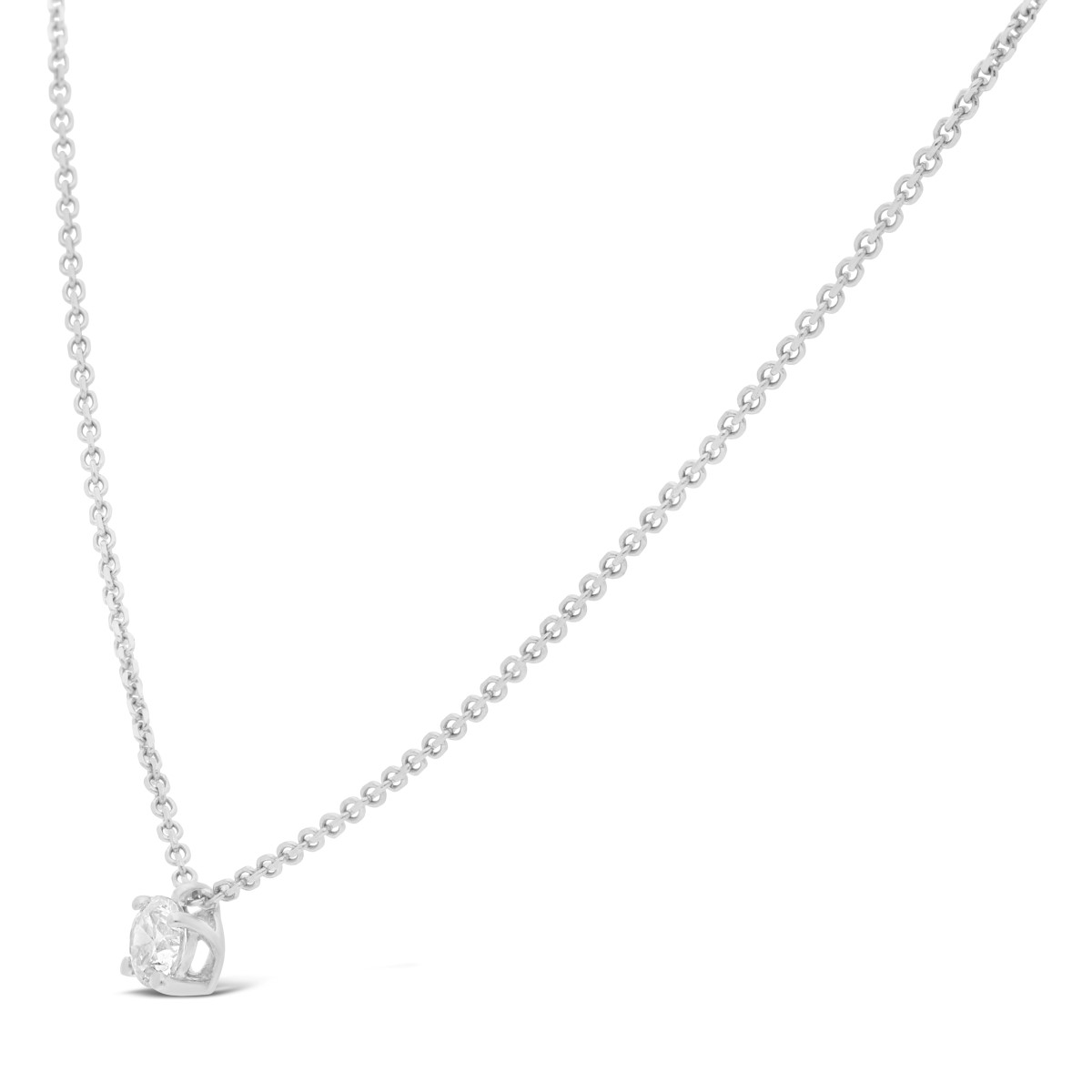 Collier en diamant solitaire 0,20 carat maintenu par 4 griffes. Le pendentif est accompagné de sa chaine maille forçat de 42 cm. Le diamètre du pendentif est de 3,8 mm.