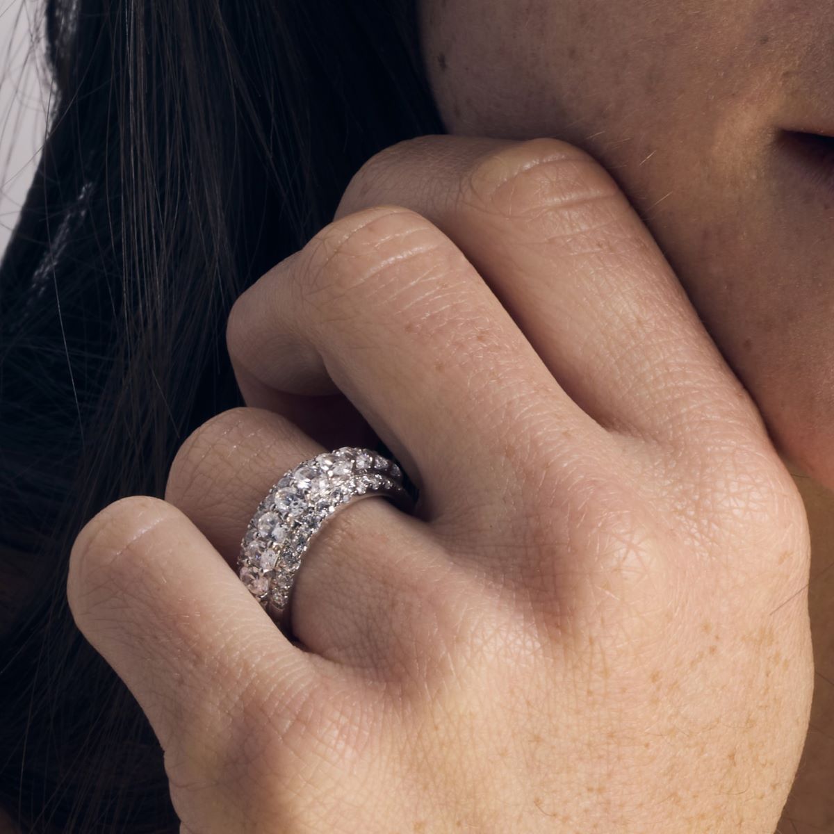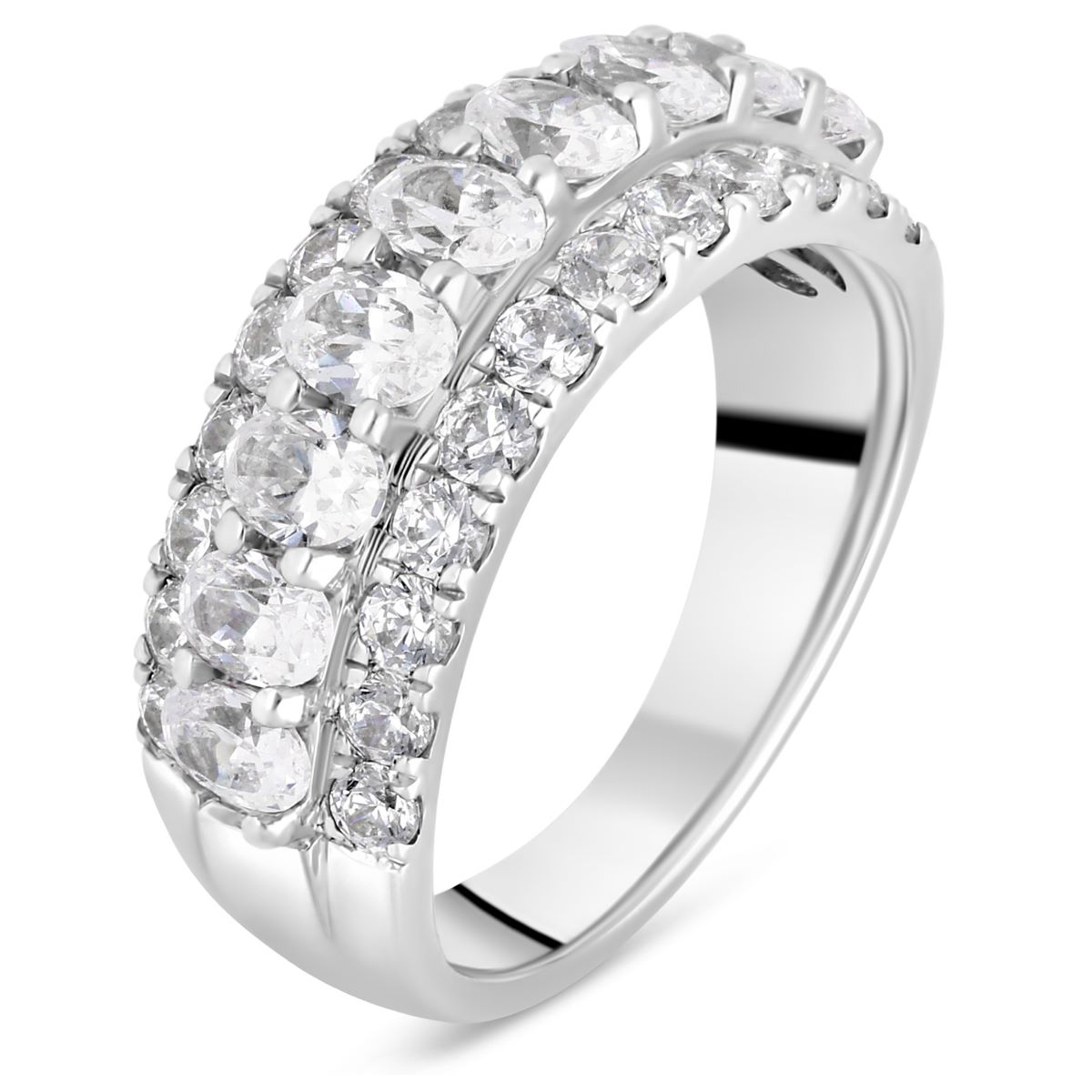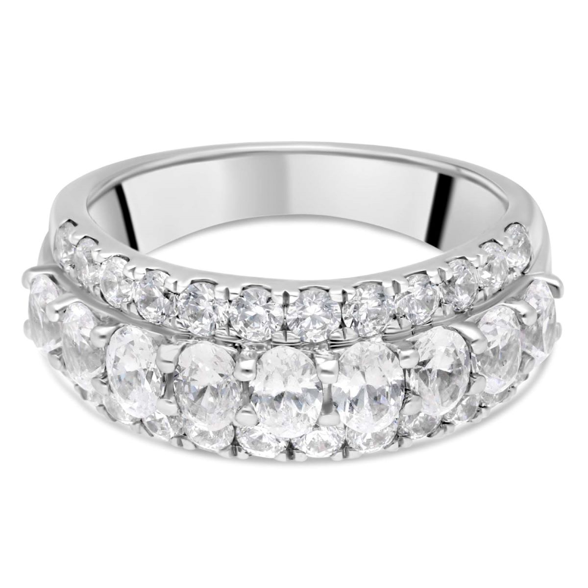 La rangée des diamants ovales est sertie en superposition sur le fond en diamants ronds, créant un demi-tour de brillance qui encercle le doigt avec grâce. Le montage est réalisé en platine, avec une finition polie.