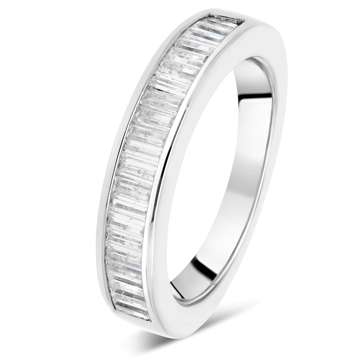 Cette alliance réussit de manière surprenante à marier le classique à la modernité grâce à ses lignes droites et son design épuré. Elle est ornée de diamants taille baguette sertis en demi tour dans un rail de platine. C'est une création exigeante en terme d'éclat et de brillance et seuls des diamants de couleur G et de pureté VS permettront de réveiller son feu !