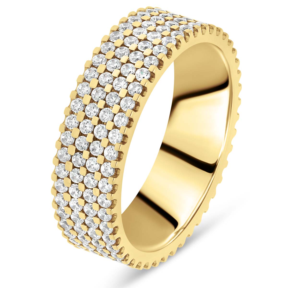 Cette alliance de mariage pour femme en or 18 carats séduit par son allure luxueuse et son éclat incomparable. Entièrement sertie en tour complet, elle dévoile quatre rangs de diamants de qualité HSI ou GVS, créant un jeu de lumière intense et raffiné.