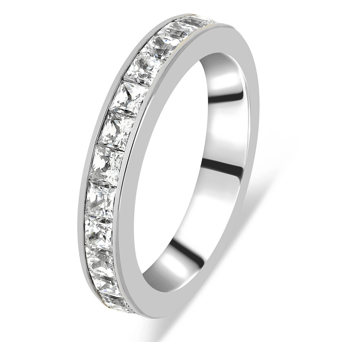Moderne, intemporelle et simplement sublime, cette alliance pour femme est sertie en tour complet de diamants taille princesse. Seuls des diamants de couleur G et de pureté VS sont capables de lui donner tout son éclat, étincelle, feu et brillance. Les diamants sont enchâssés dans de fins rails de métal. Cette alliance se décline en plusieurs versions de poids carat. Vous pouvez également choisir entre platine, or blanc ou or jaune 18 carats.