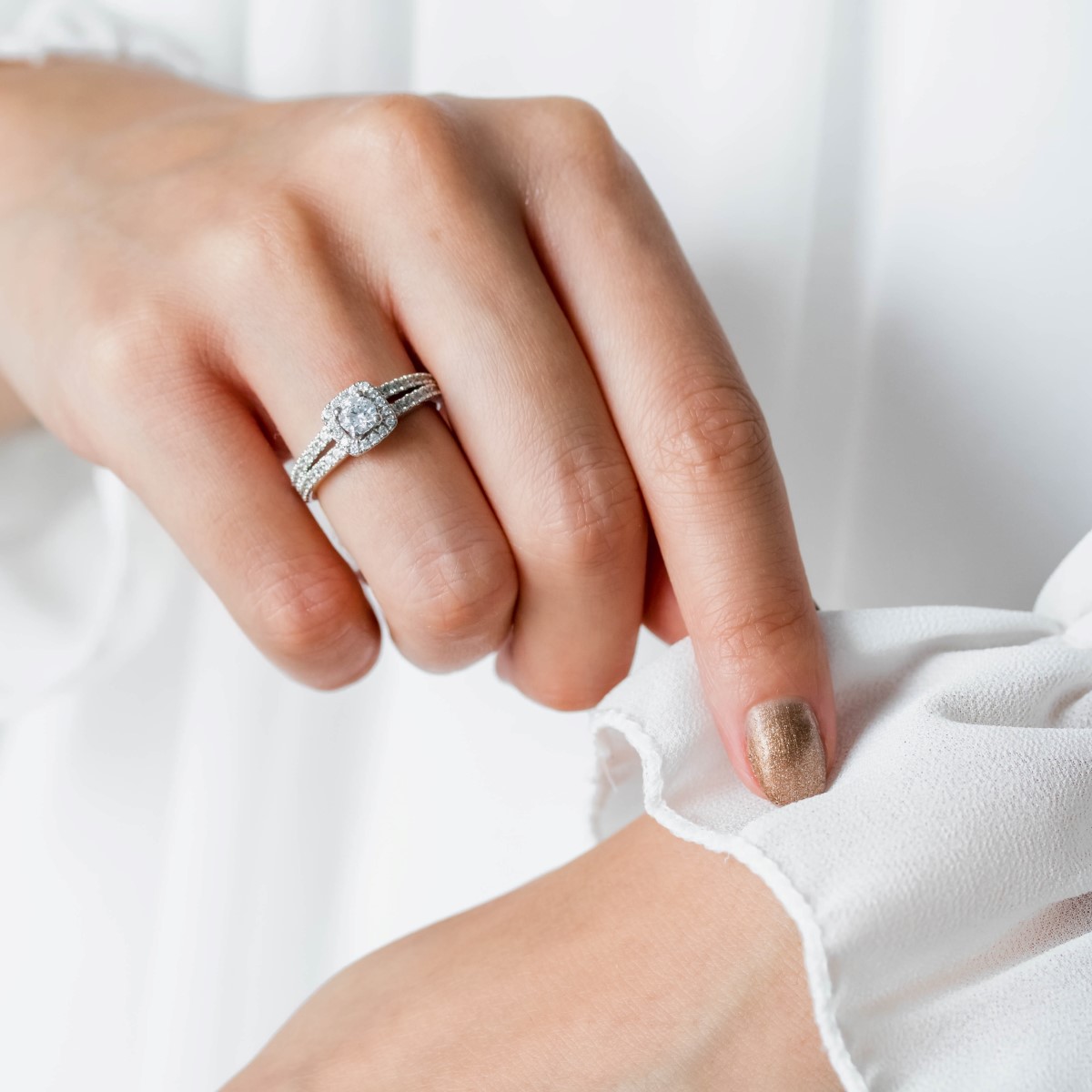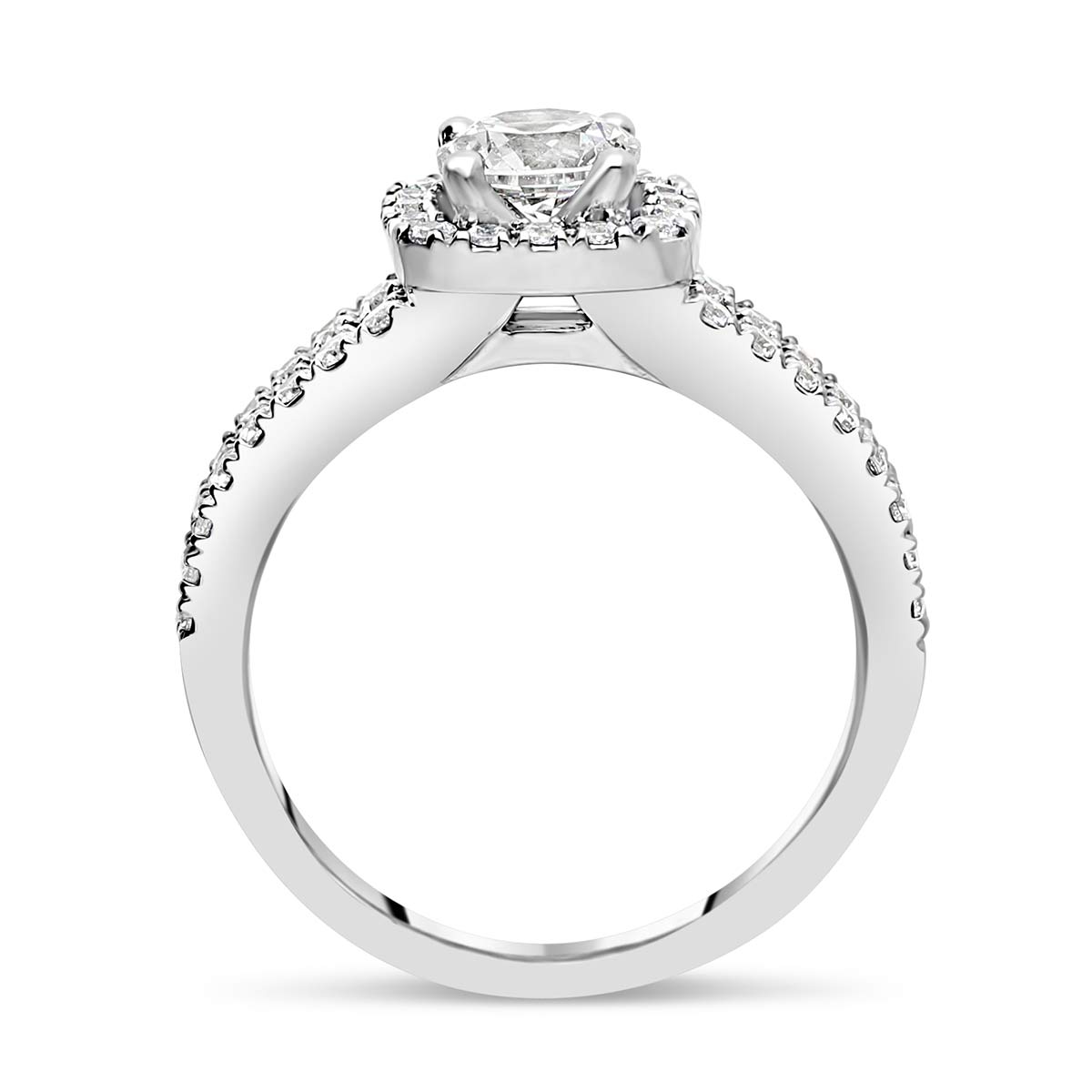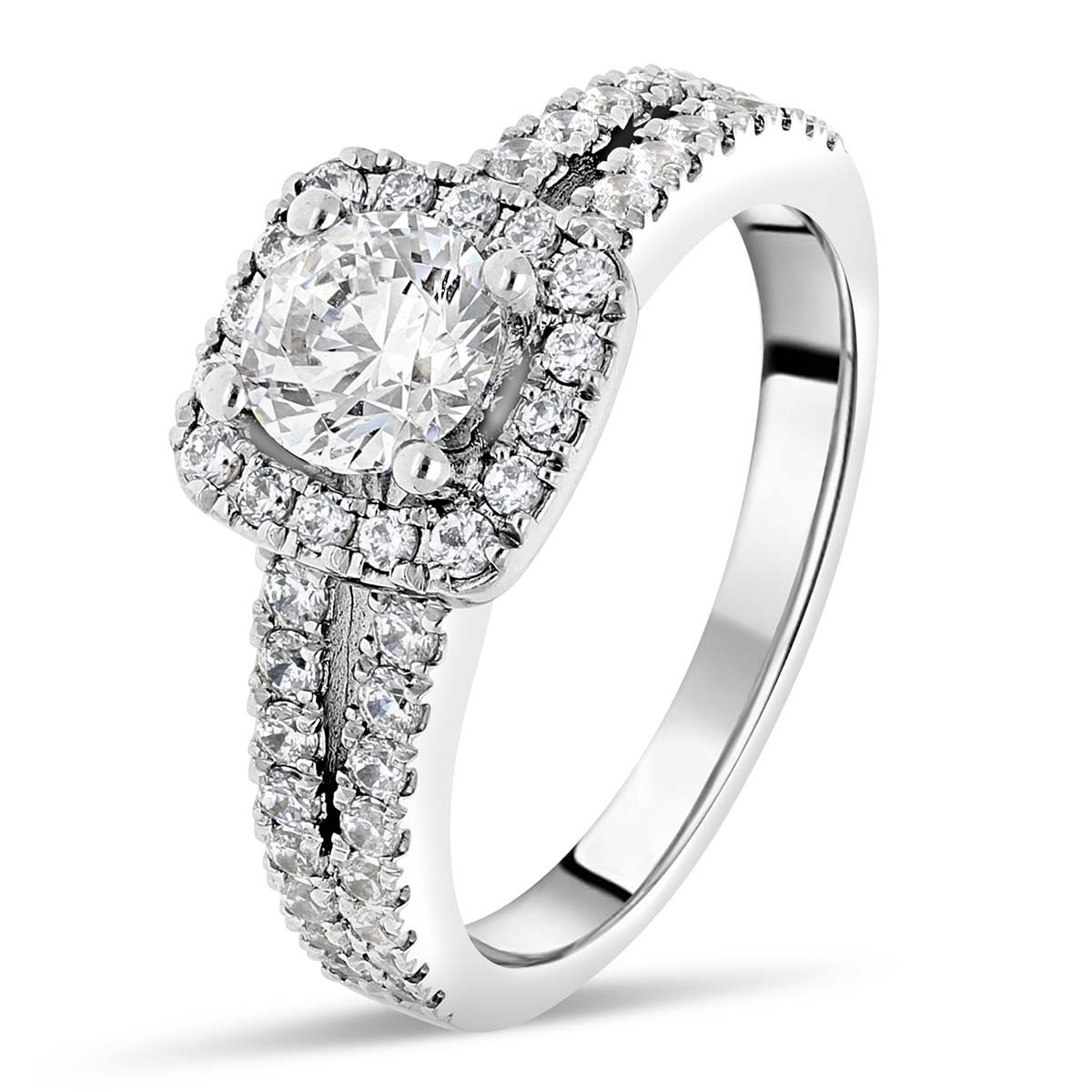 Notre somptueuse bague « Rhodes » met en vedette un diamant central brillant rond, encadré par un halo carré aux coins arrondis de petits diamants. Ce design ingénieux augmente visuellement la pierre centrale et lui donne plus de brillance. L'anneau se divise en deux branches qui s'élancent vers la pierre centrale, chacune sertie de petits diamants en demi-tour.