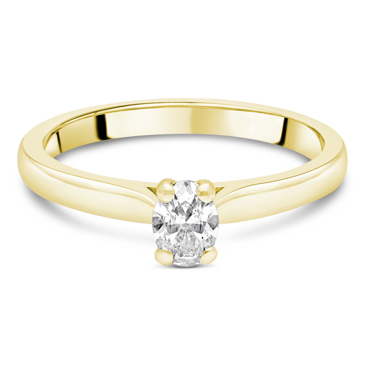 Cette bague de fiançailles minimaliste et élégante présente un diamant ovale en son centre, qui incarne à la fois la simplicité et le raffinement. Le diamant est maintenu par un sertissage à quatre griffes. L'anneau en or jaune est lisse et poli, sans ornements supplémentaires, ce qui renforce l'élégance classique de la bague. La simplicité de l'anneau met en valeur la beauté naturelle de la pierre, créant un look harmonieux et intemporel.