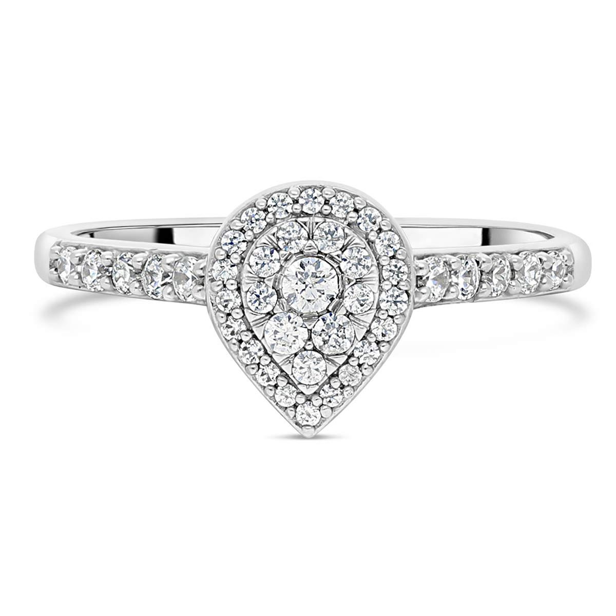 Une bague de fiançailles en or 750 millièmes (18 cts) composée d'un pavage de diamants en forme de poire au centre (la longueur de 9 mm) et d'un accompagnement en diamant sur l'anneau. Les diamants au poids total de 0,36 cts sont sertis en mini griffes.