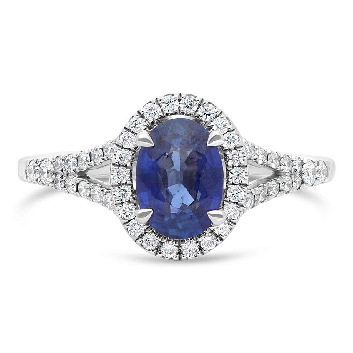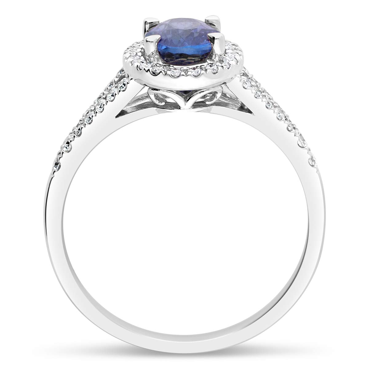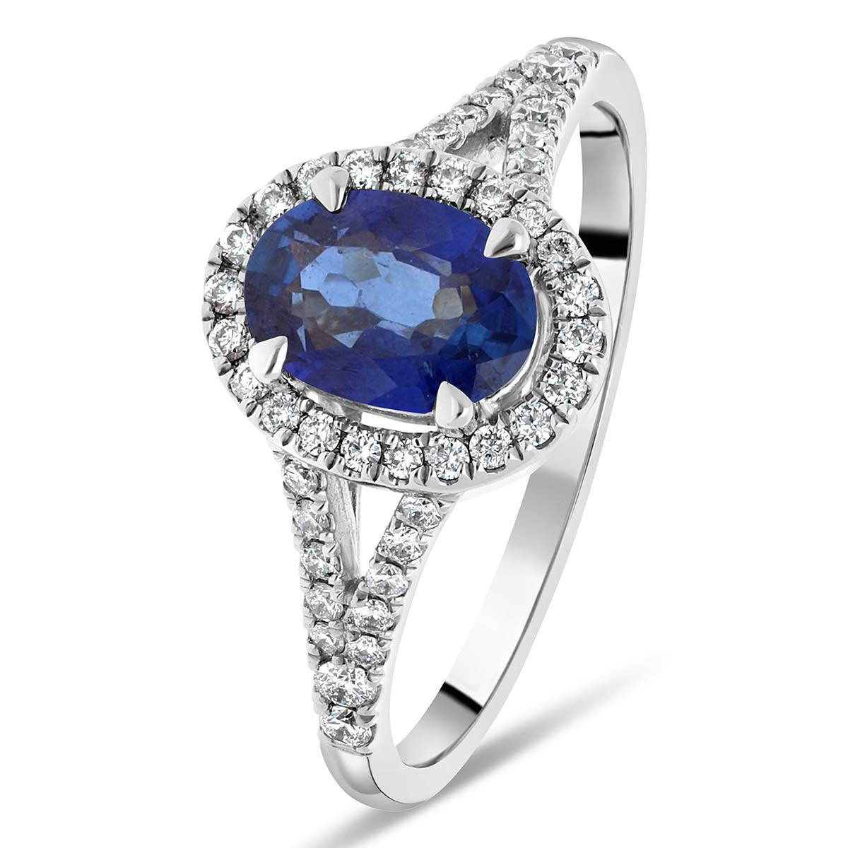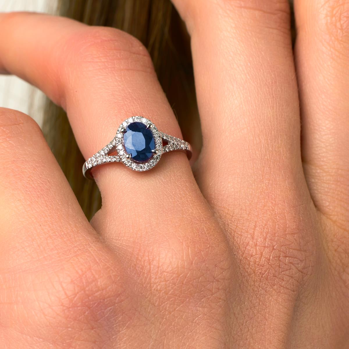 La Romantique est une bague de fiançailles ornée d'un magnifique saphir ovale. Sa monture est embellie par de diamants pavés autour de la pierre centrale et sur les deux branches de l'anneau. La bague est réalisée en or 18 cts (750/1000) dont la couleur est personnalisable.