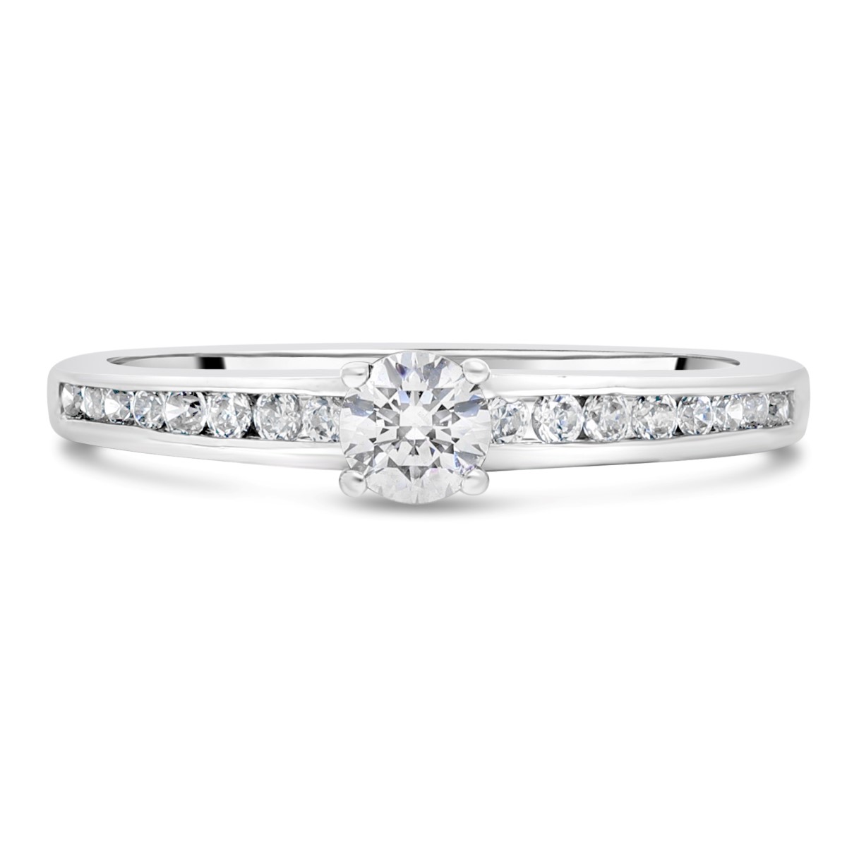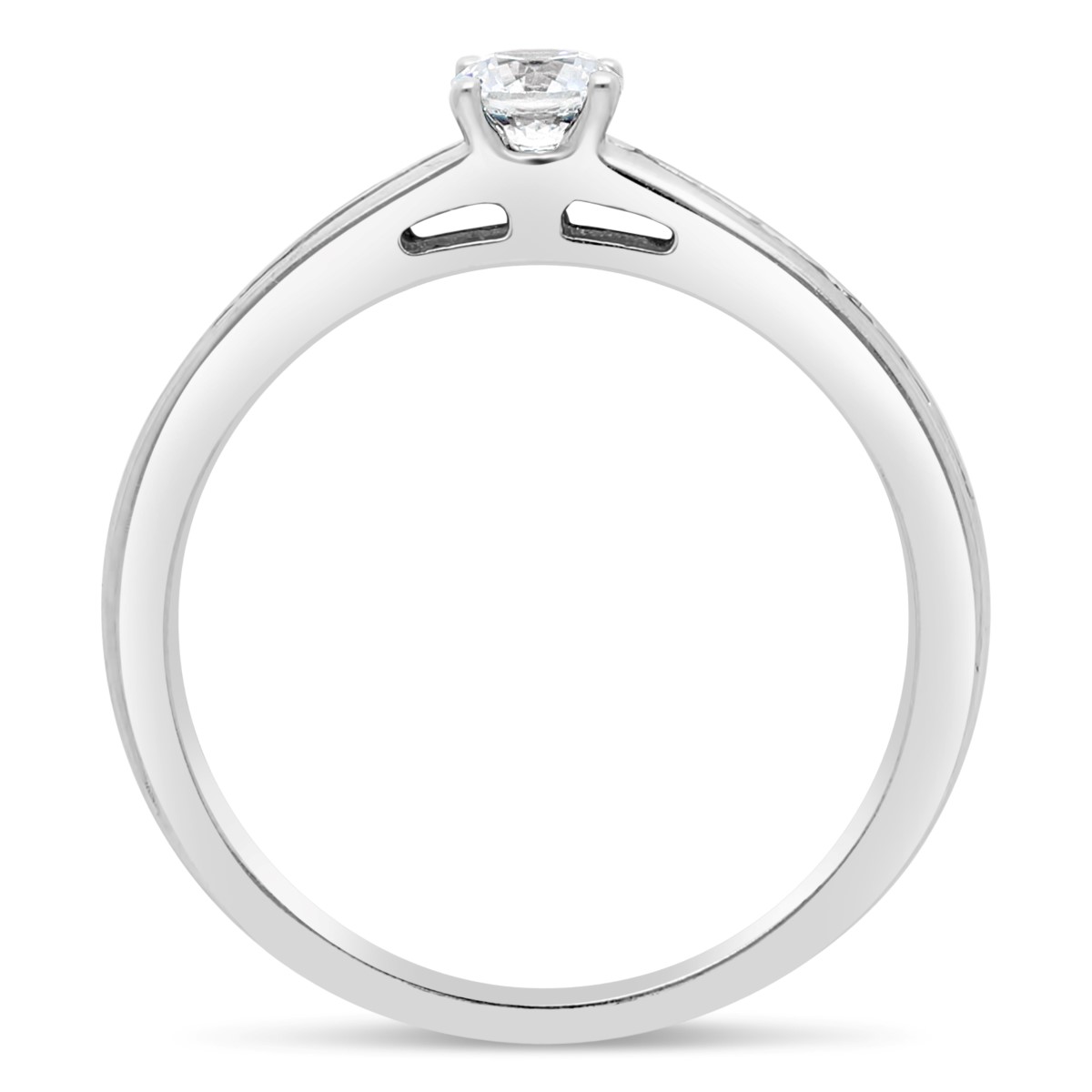 Une bague de fiançailles en or 18 carats ornée d'un diamant solitaire taille brillant HSI de 0,20 carats au centre. La pierre est maintenue par 4 griffes et est mise en lumière par un accompagnement de diamants HSI de 0,17 carats sertis sur le corps de la bague en rail fin. La largeur de la bague : 3,8 mm au centre et 1,8 mm au point le plus fin de l'anneau.