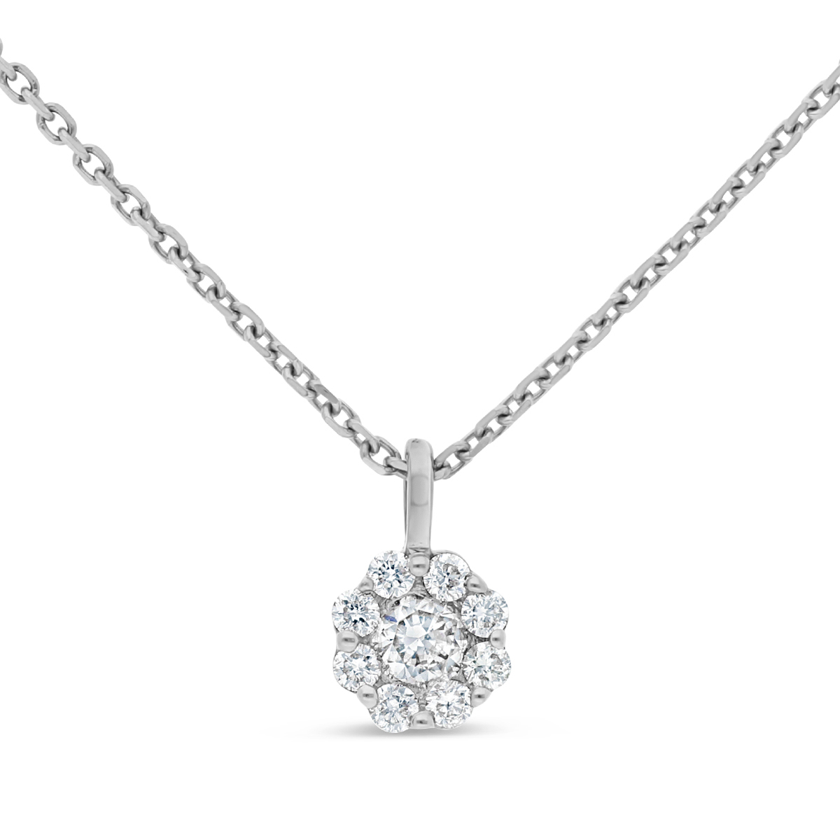 Collier serti de diamant pavés en fleur. Le pendentif est vendu avec sa chaîne en maille forçat de 42 cm (réglable). Le diamètre du pendentif est de 5,5 mm (la longueur avec la bélière est de 8,8 mm).