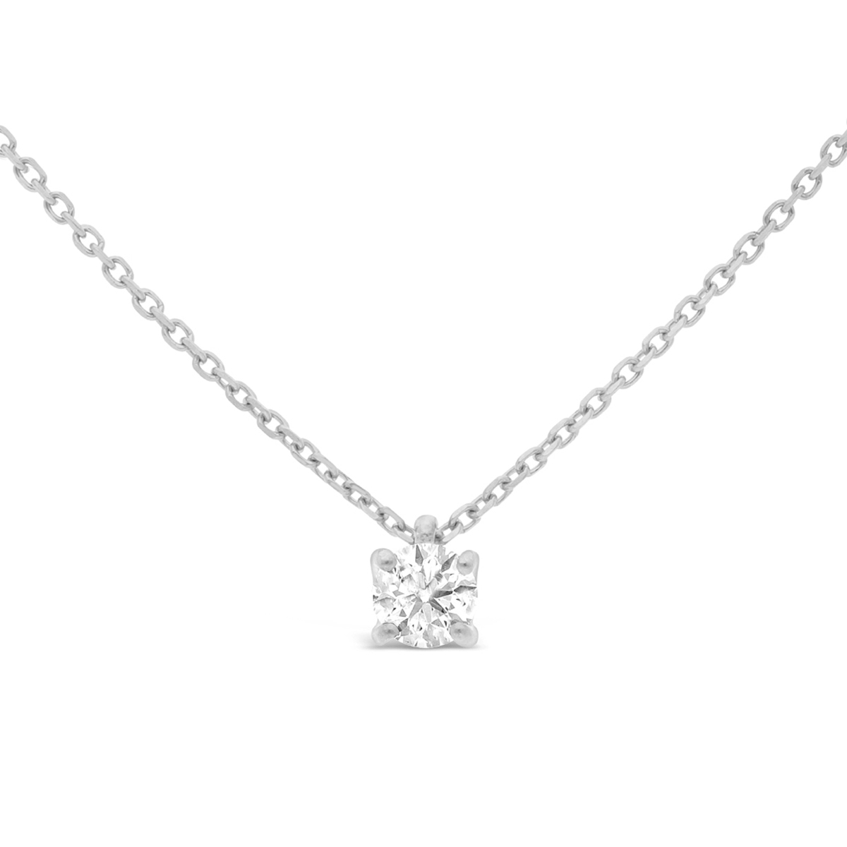 Collier en diamant solitaire 0,20 carat maintenu par 4 griffes. Le pendentif est accompagné de sa chaine maille forçat de 42 cm. Le diamètre du pendentif est de 3,8 mm.