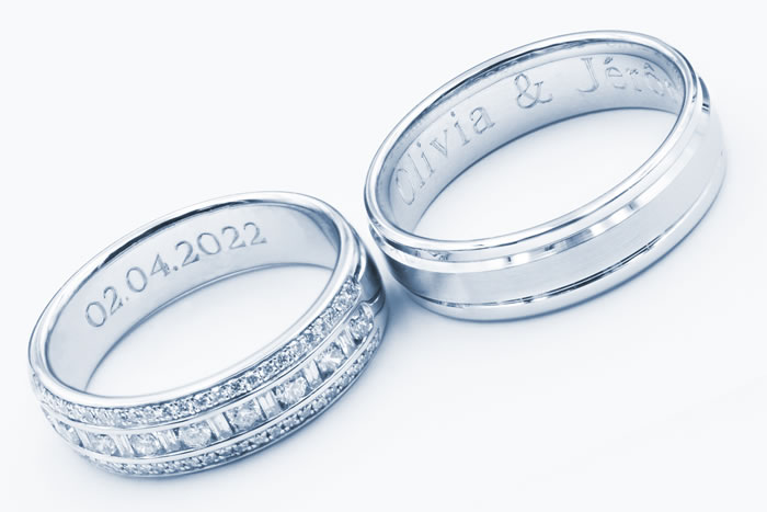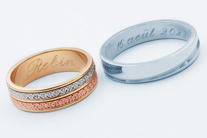 • Attention : Sur les alliances fines de moins de 2 mm ou sur les alliances bombées de moins de 3mm, la gravure calligraphiée n’est pas bien lisible. Nous vous conseillons d’opter dans ce cas pour la police en « bâtons ». La police calligraphiée est également à éviter lorsque le texte que vous souhaitez faire graver est entièrement composé de lettres majuscules.